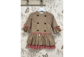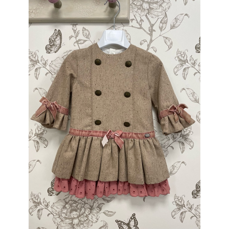 VESTIDO manga larga color beig oscuro con detalles rosa.