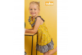 Volante en el cuello en vichy que va sobre los hombros y remata a modo de tirantes en la espalda.