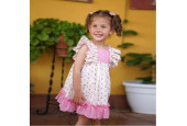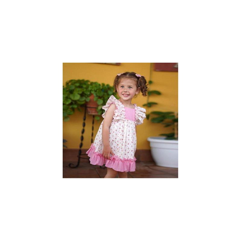 Vestido sin mangas en tejido estampado florecitas en tonos rosa.