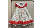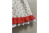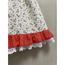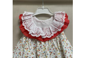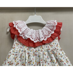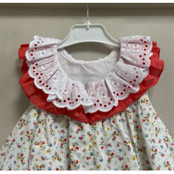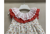 Cuello redondo con doble volante en plumeti y puntilla blanca igual que el bajo.