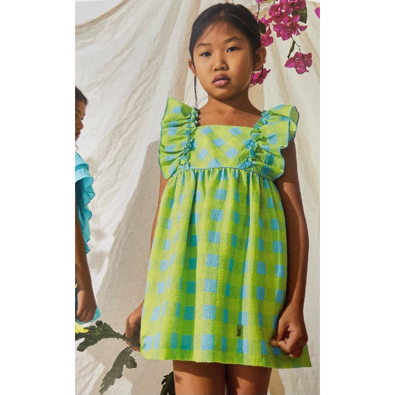 VESTIDO cuadros flúor de talle alto y escote cuadrado.