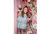 Vestido cuadritos vichy verde empolvado y blanco con volantes y lazo.