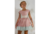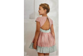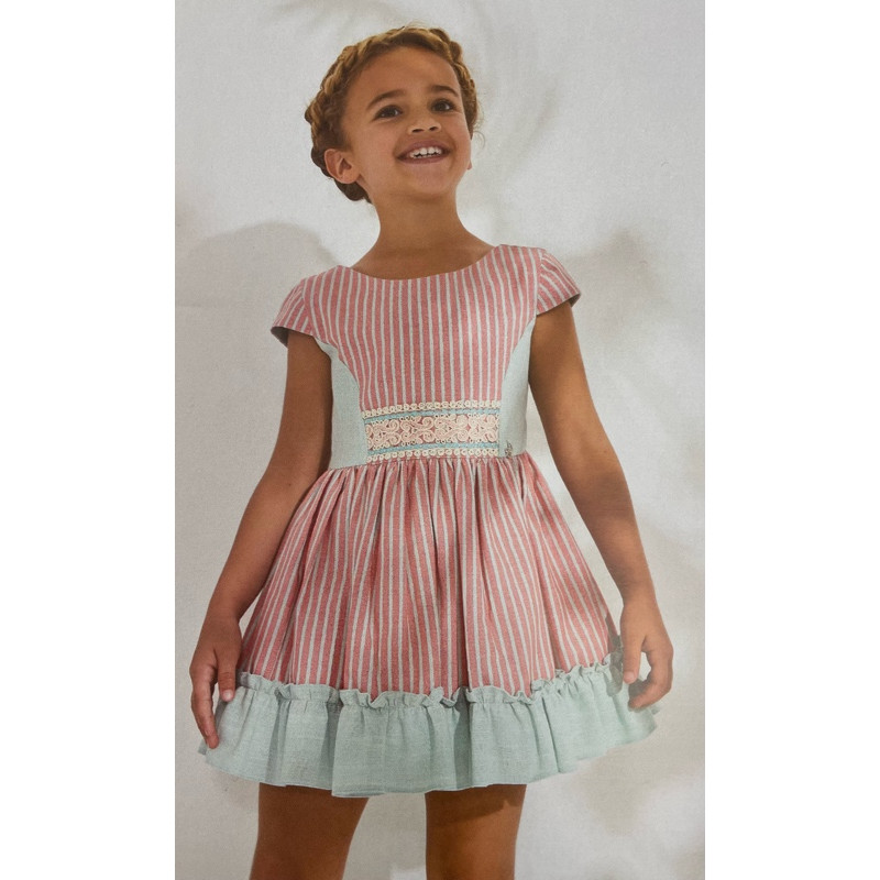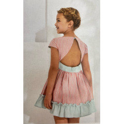 VESTIDO INFANTIL de rayas coral y verde agua con abertura en la espalda.