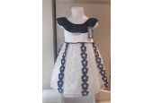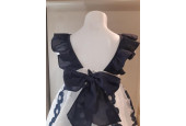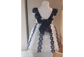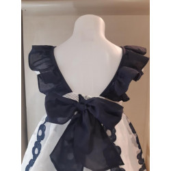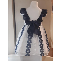 Vestido cuerpo piqué blanco y falda de organdi con bordados color azul marino
