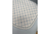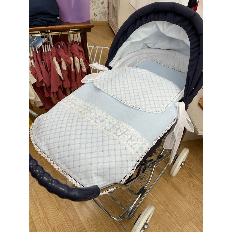 Saco de capazo confeccionado en piqué celeste combinado con tejido bordado y puntilla blanca.