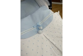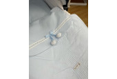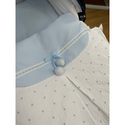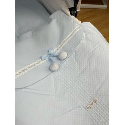 Confeccionado en pique blanco con bordado de bodoques en azul y embozo de piqué azul.