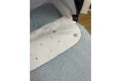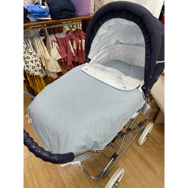 Saco de capazo universal confeccionado en piqué azul empolvado y bordado estrellas en color gris.