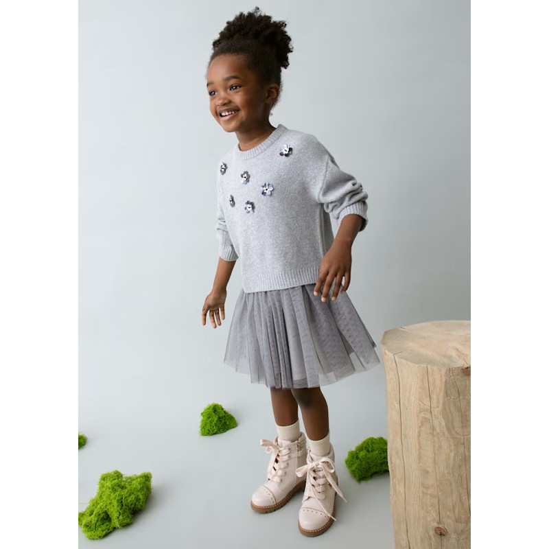 VESTIDO sin mangas que lleva sobrepuesto un jersey de punto en color plata con apliques.