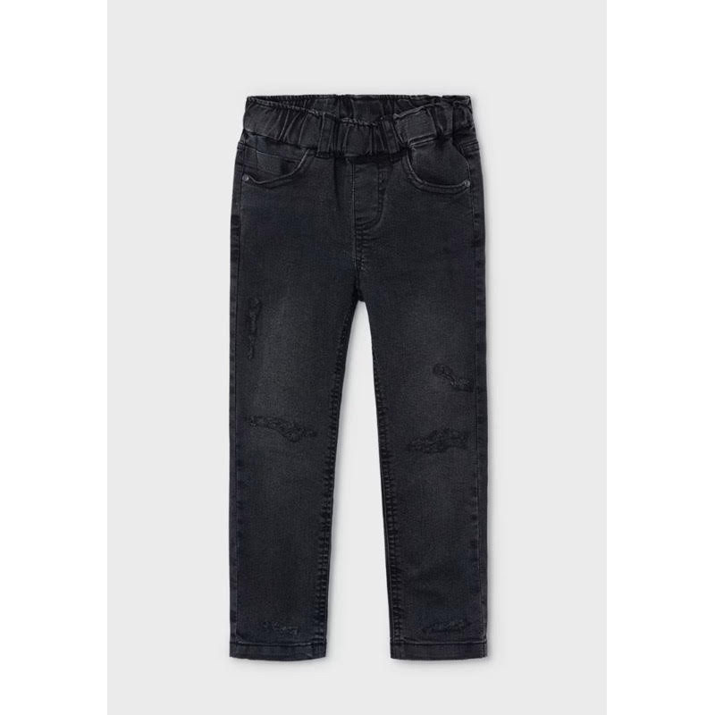 PANTALÓN vaquero en color negro con goma elástica en la cintura y modelo 5 bolsillos.