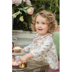 Conjunto de jesusito en tela estampada de manga larga con cuello. Cuerpo con forro y botones en la espalda.