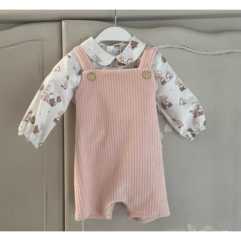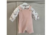 CONJUNTO de 2 piezas con peto de pana rosa y blusa estampada con cuello bebé.