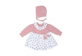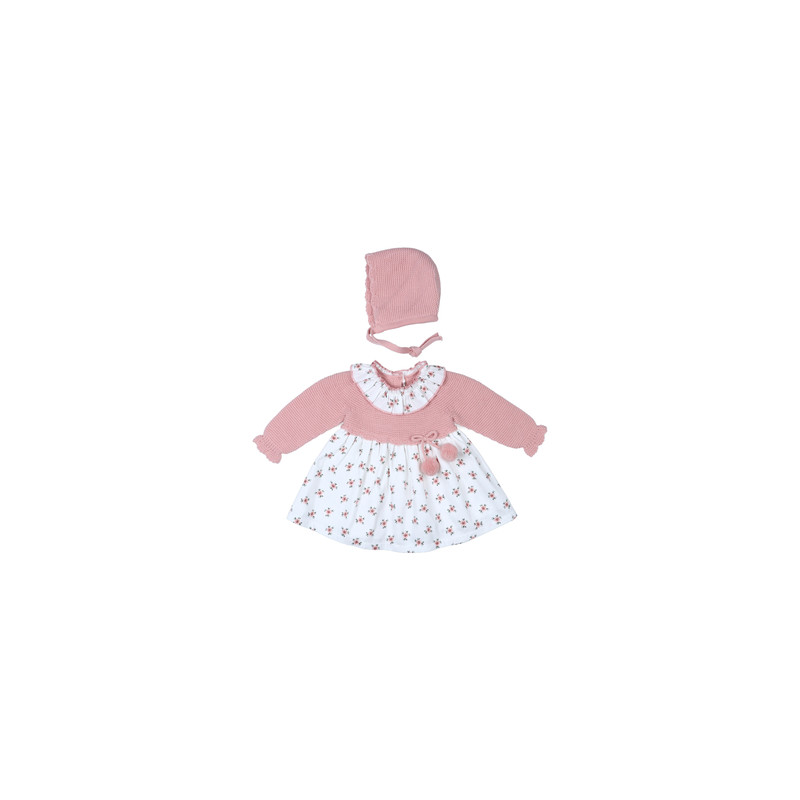 VESTIDO de manga larga con cuerpo de punto en color rosa palo, con falda estampado flor y volante en el cuello.